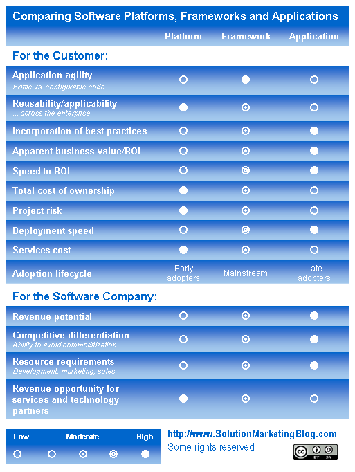 It’s almost a rite of passage for software companies… Sooner or later most software companies have to choose between offering platforms or applications.  The two paths are quite different… platforms require technical differentiation, a large partner ecosystem and broad applicability.  Apps require domain knowledge and specialization.  Innovative early adopter customers favor flexible platforms while risk-averse laggard customers often prefer apps with a short “last mile.”