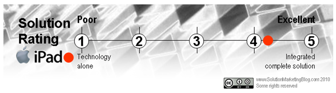 Since January, I’ve been researching the Apple iPad in order to rate it as a solution. I even took one for a test drive on Sunday (thanks Jeff Berg of Purple Shark Consulting!). The rating is actually a strategic tool that enables marketers to meet customer needs by offering a complete solution. But the Apple iPad has generated so much hype that it’s a great solution to evaluate. The iPad received a rating of 4.3 out of 5. By comparison, most other tablet offerings today would probably score 2.5 or lower on the solution rating scale. The best possible score is 5 (complete solution) while the lowest is 1 (product, not a solution). This is an independent evaluation and was not funded by Apple.